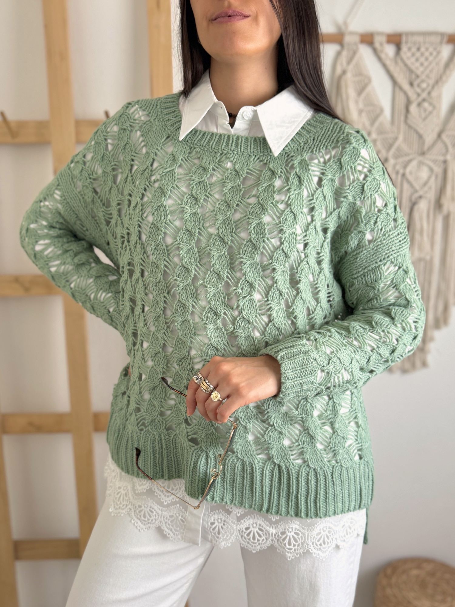 Buzo calado, realizado en hilo. Viene en talle único, que abarca un M/L aproximadamente.