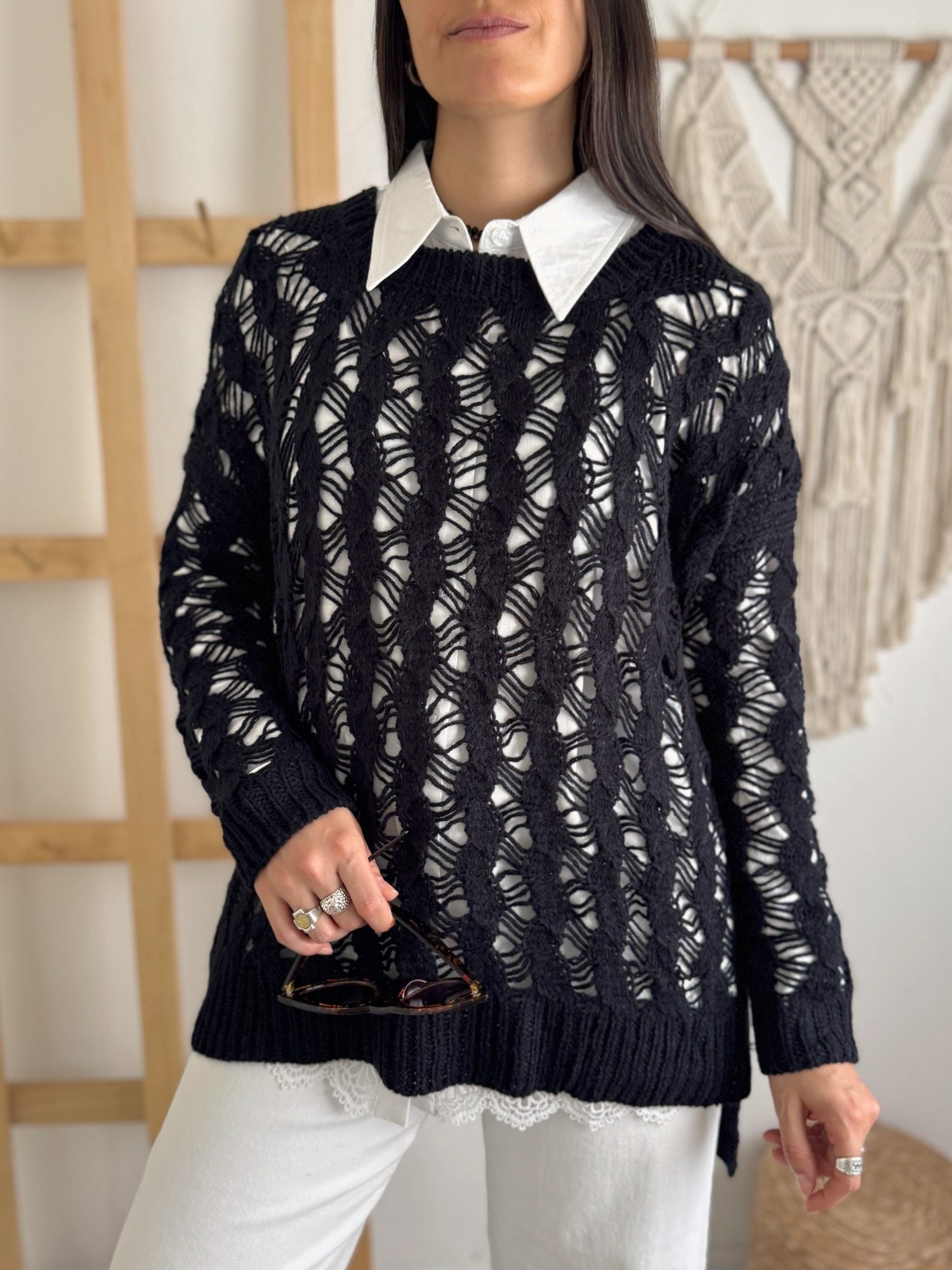 Buzo calado, realizado en hilo. Viene en talle único, que abarca un M/L aproximadamente.