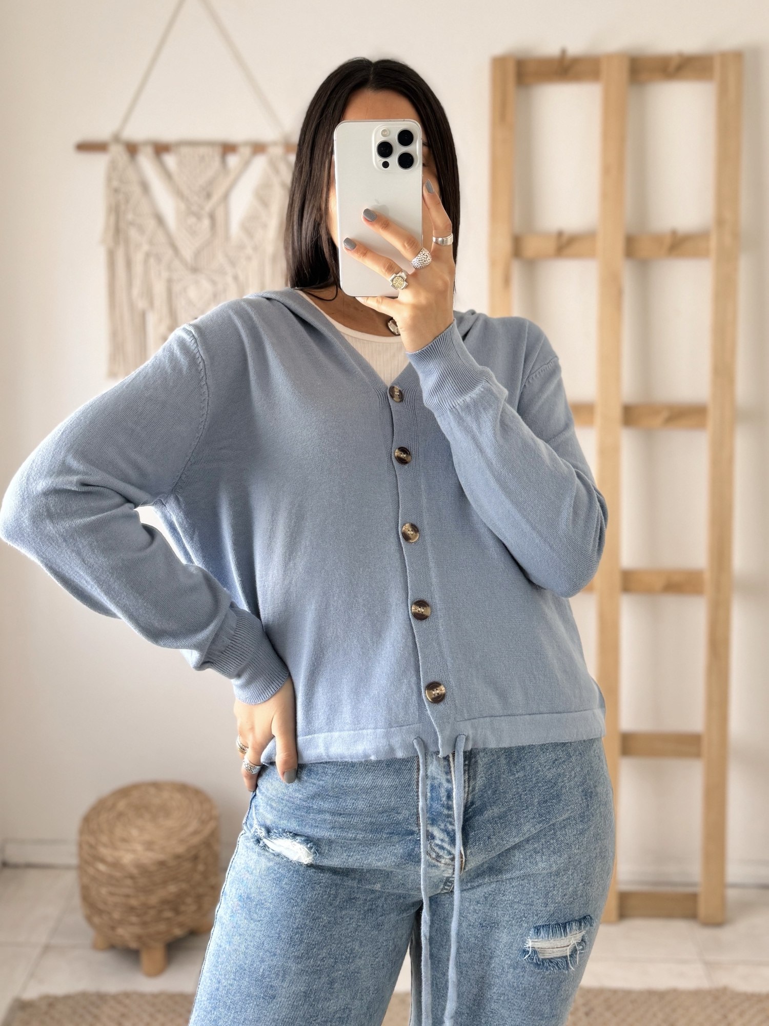 Saco corto, fino, ideal para media estación. Cintura regulable. Viene en talle único, que abarca un M aproximadamente.