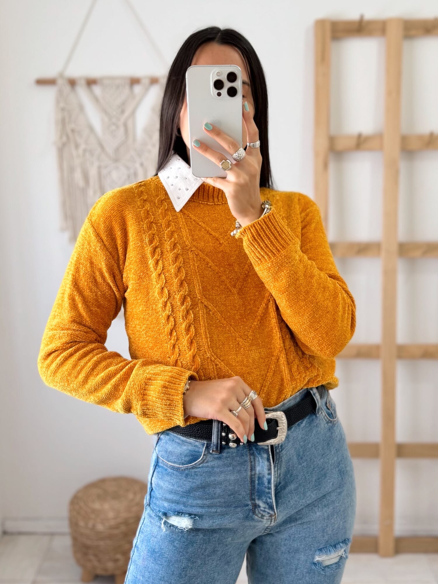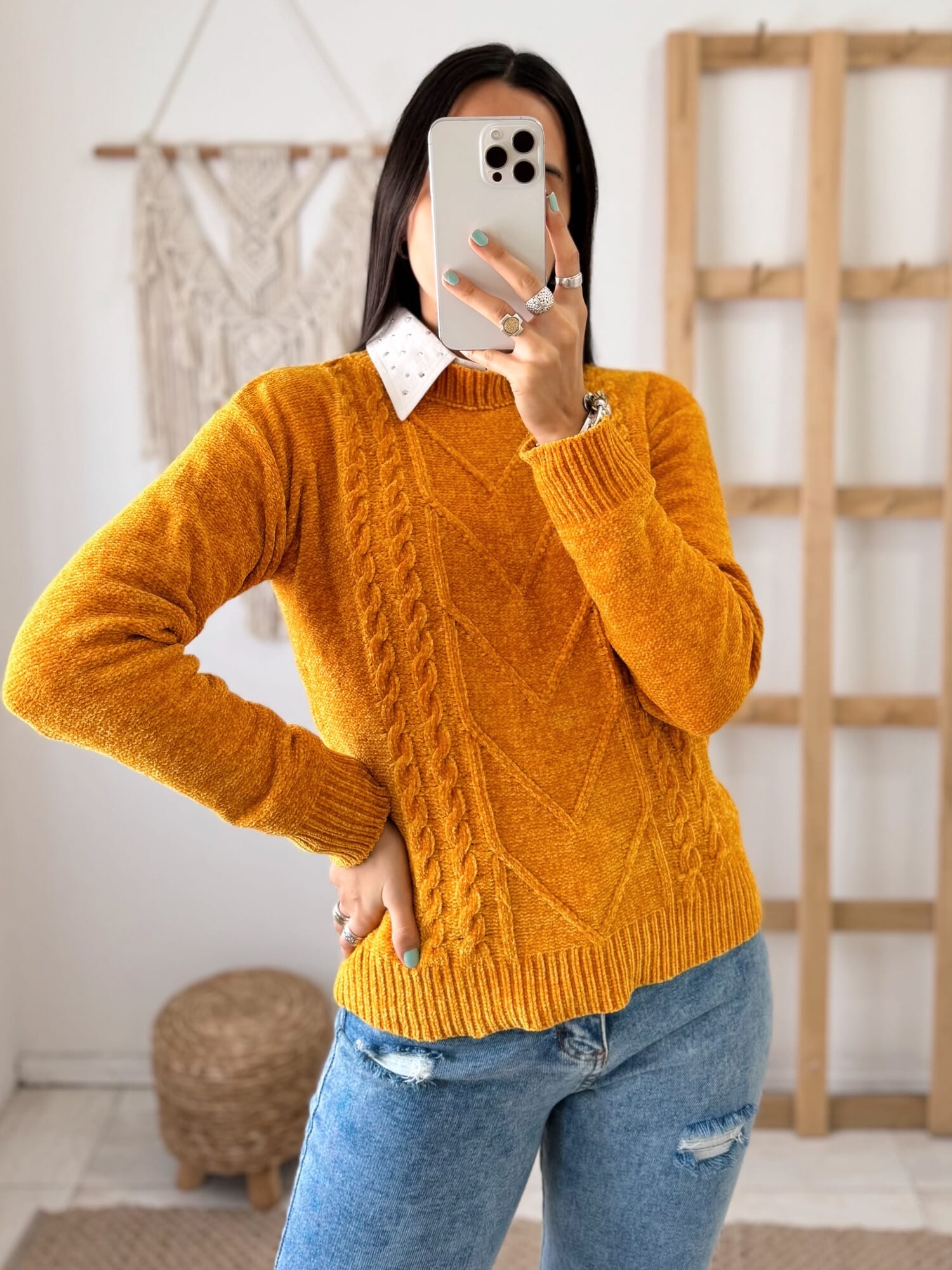 Sweater tramado, realizado en chenille. Viene en talle único, que abarca un M aproximadamente.